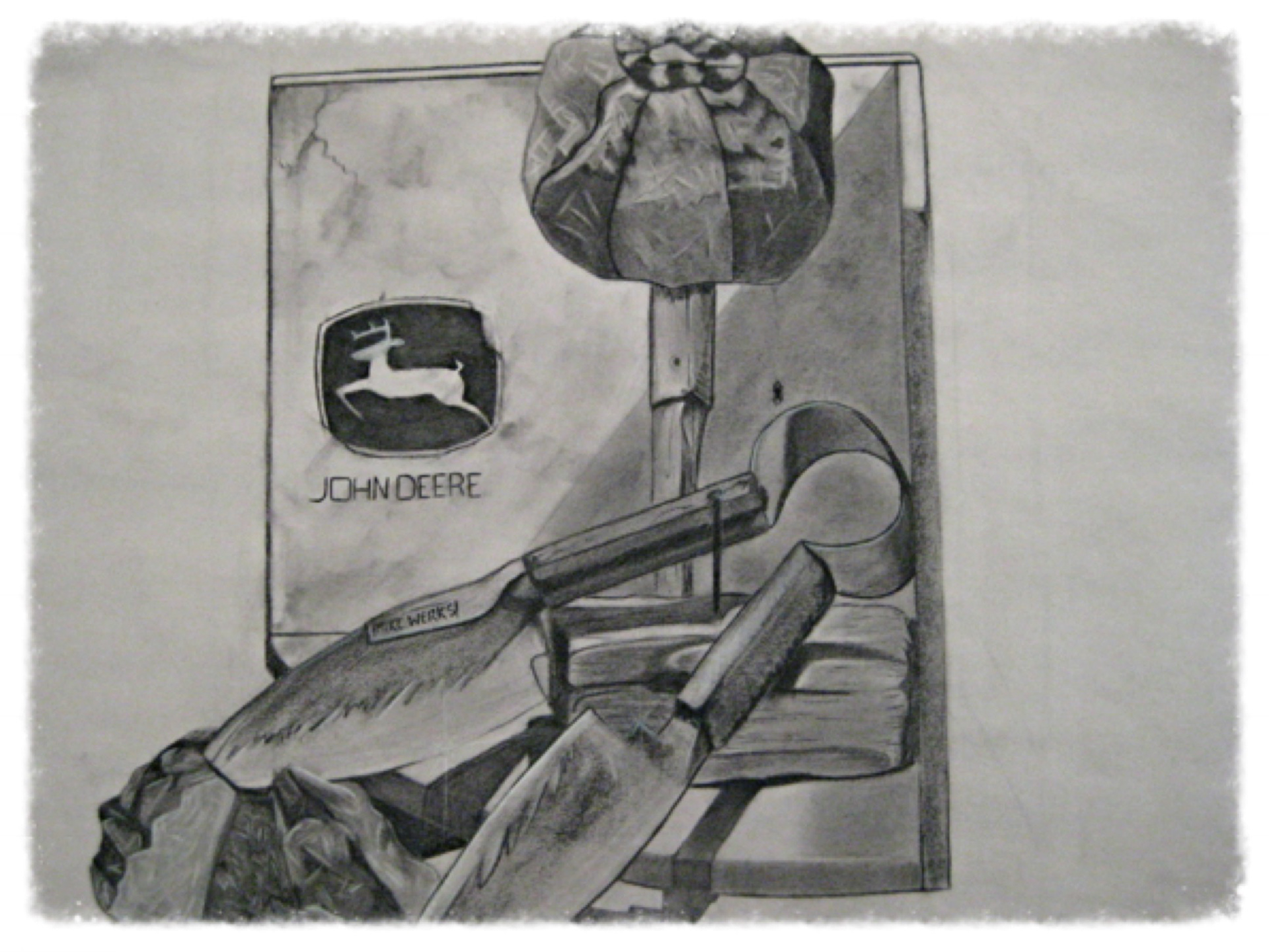 John Deere sticker on a corner piece, gardening shears on a block of old wood and a couple of small beach balls.