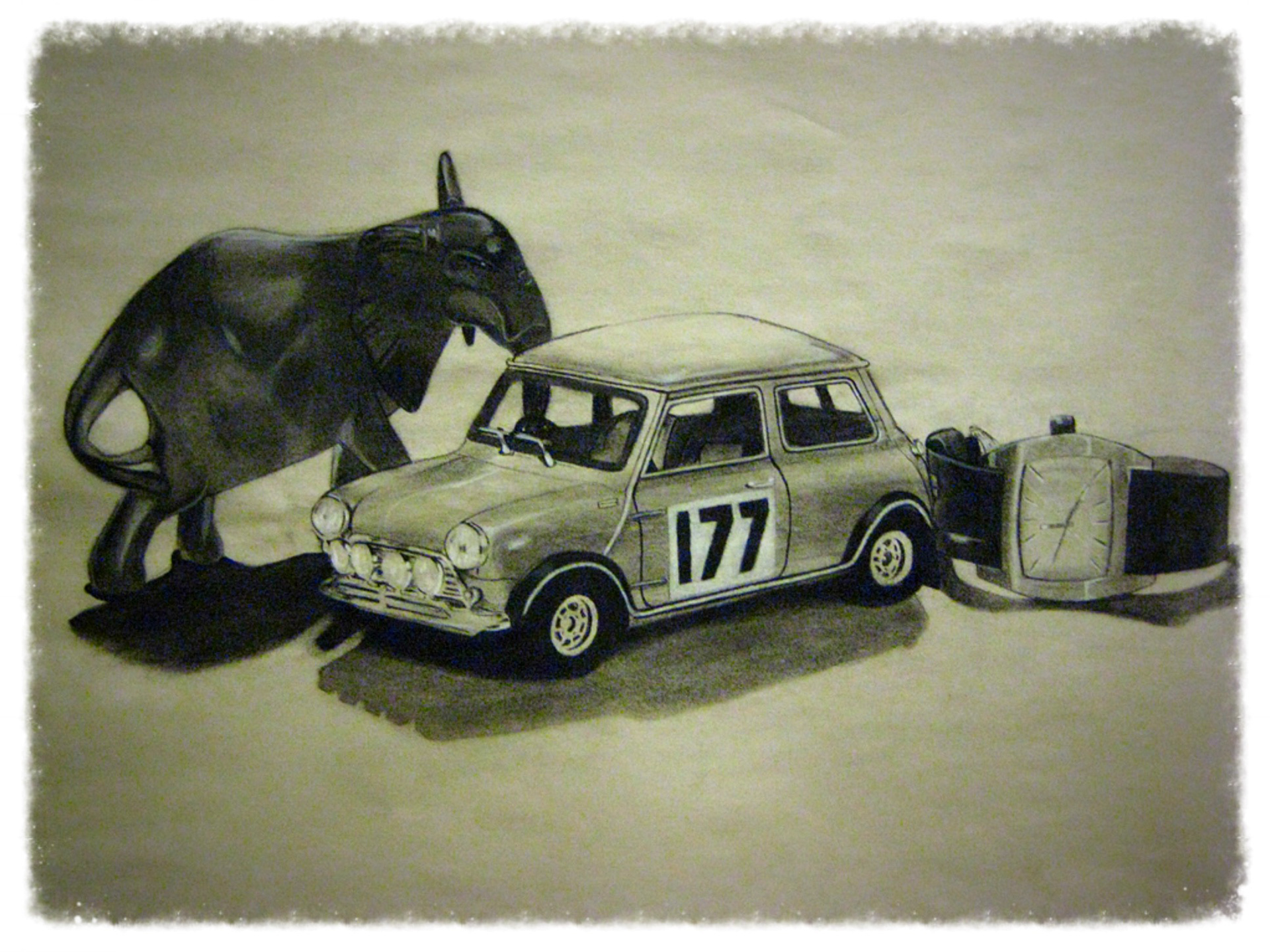 A small sculpture of an elephant, plastic scale model of a Mini Cooper and a mens watch.