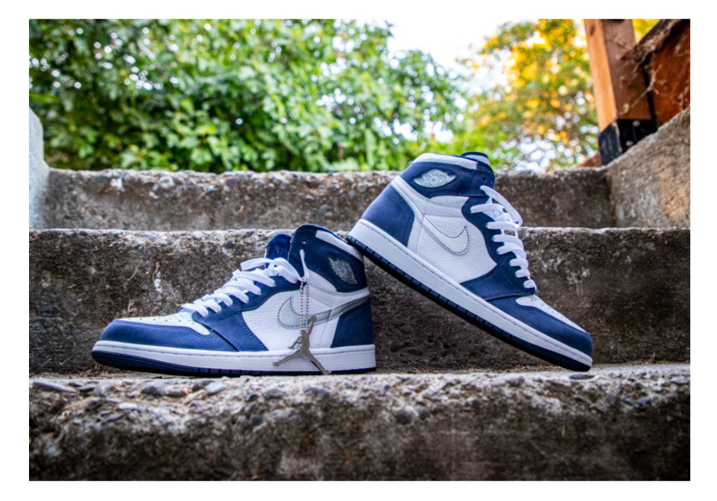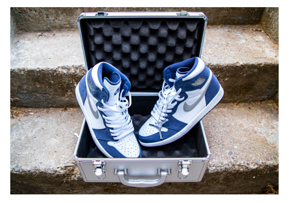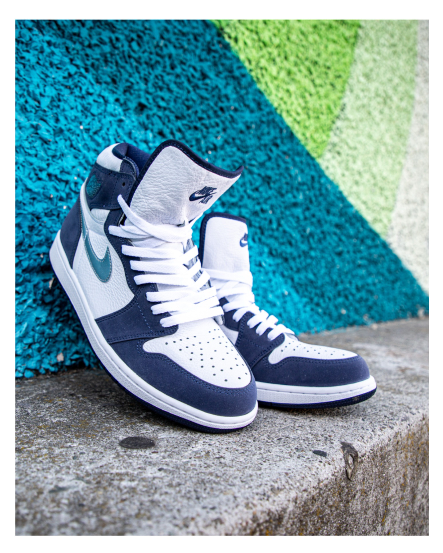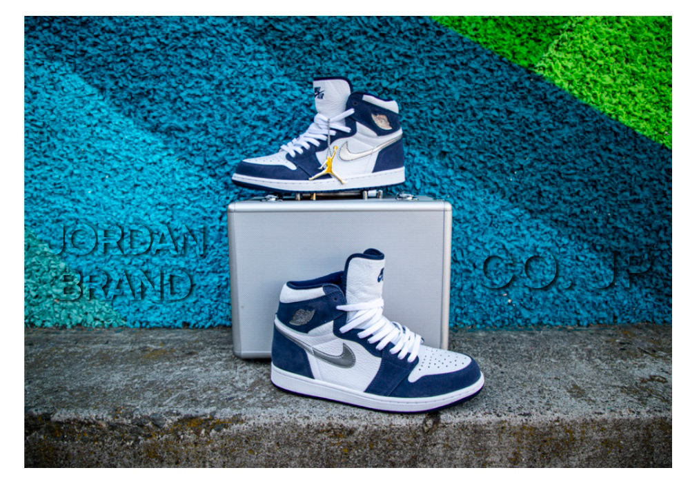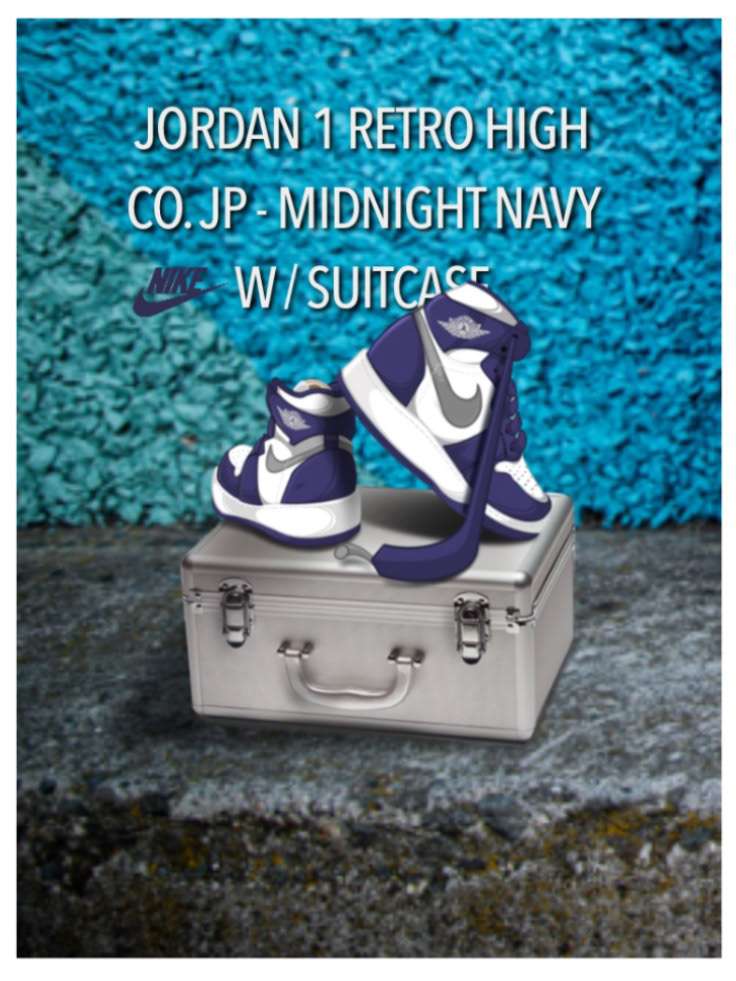 The Air Jordan 1 Retro High Co. JP 'Midnight Navy' Suitcase Special Box, released exclusively in Japan in October 2020, based on a previous exclusive from 2001. Appearing almost identical to its predecessor, the shoe's upper is built with a white leather base, overlaid by Midnight Navy suede and highlighted by a metallic silver Swoosh and 'Wings' logo and includes a silver Jumpman hang tag.
