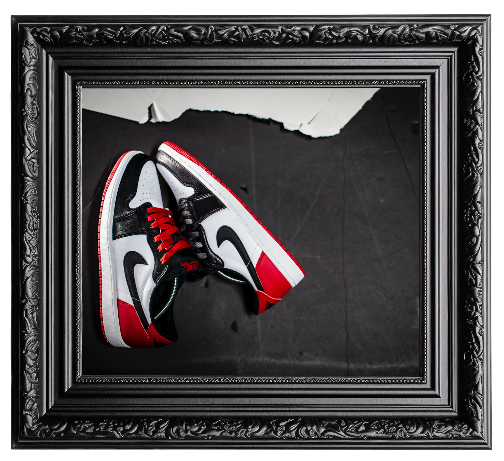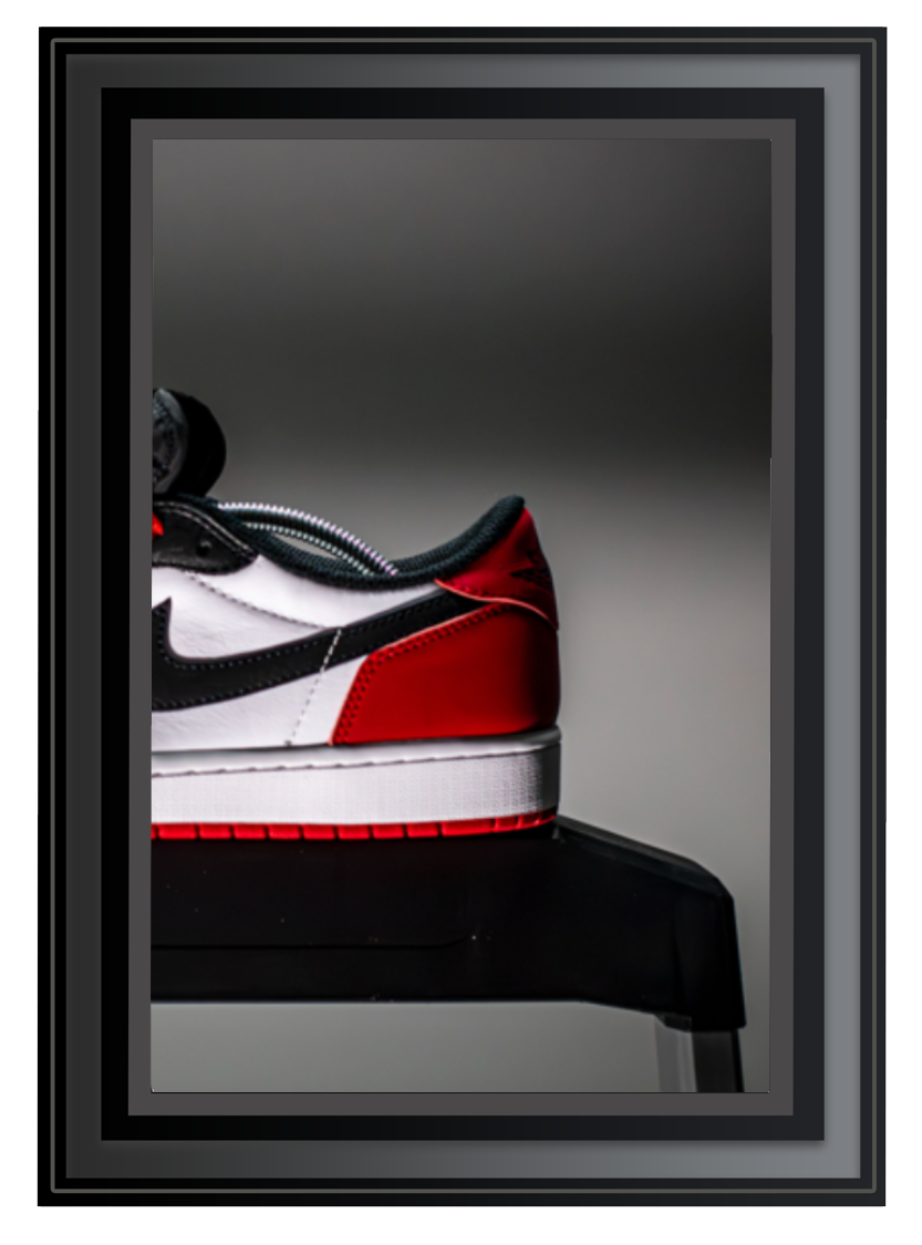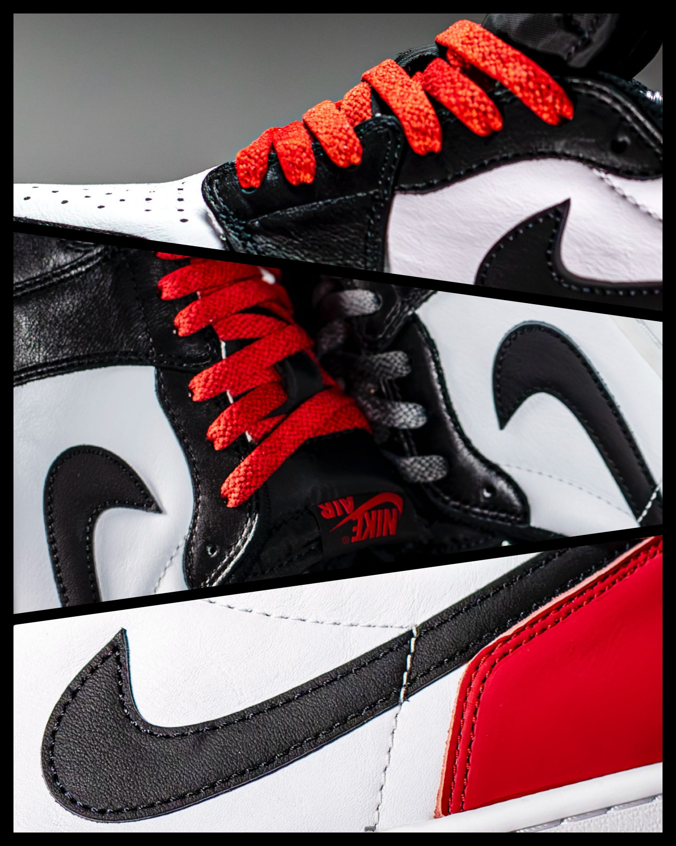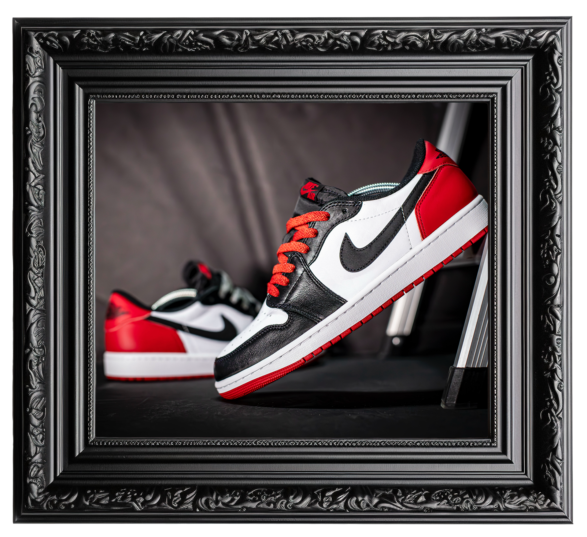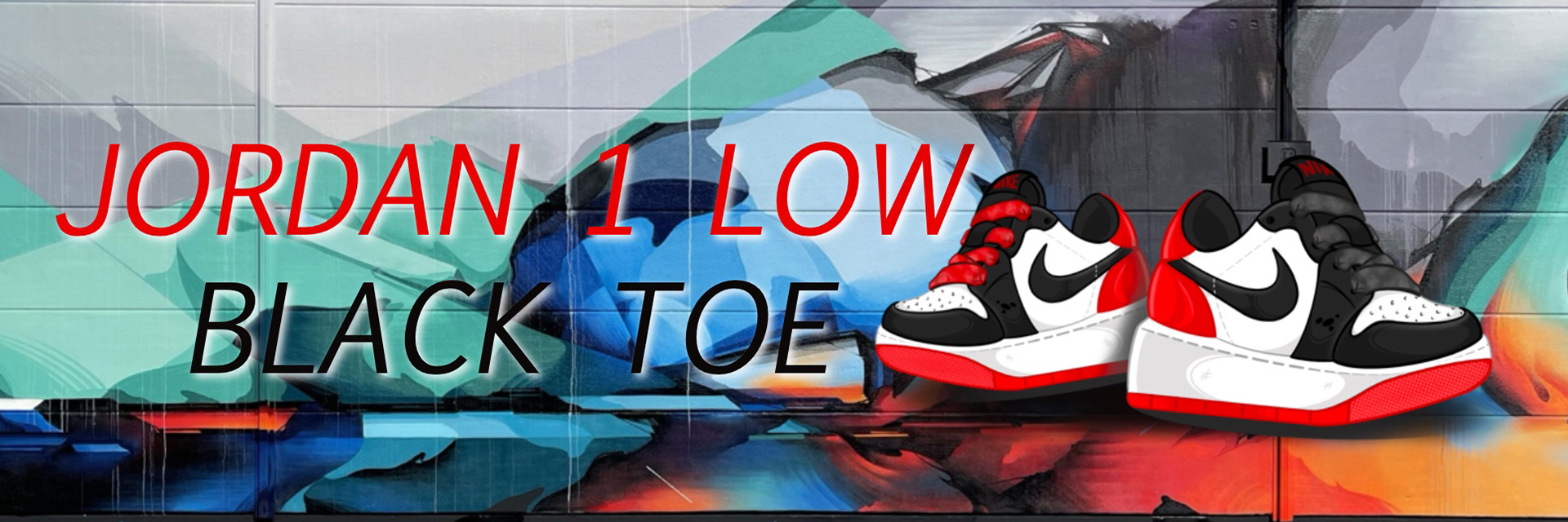 The Air Jordan 1 Retro Low OG 'Black Toe' of 2023 revives a popular original color scheme from 1985. The low-cut shape showcases a leather exterior with black and Varsity Red overlays on the forefoot and heel, respectively, against a white backdrop. The design also features a black Swoosh, a black Wings logo on the red leather heel patch and a Nike tongue label. A sturdy cupsole underfoot pairing white sidewalls with a red rubber outsole for optimal traction.