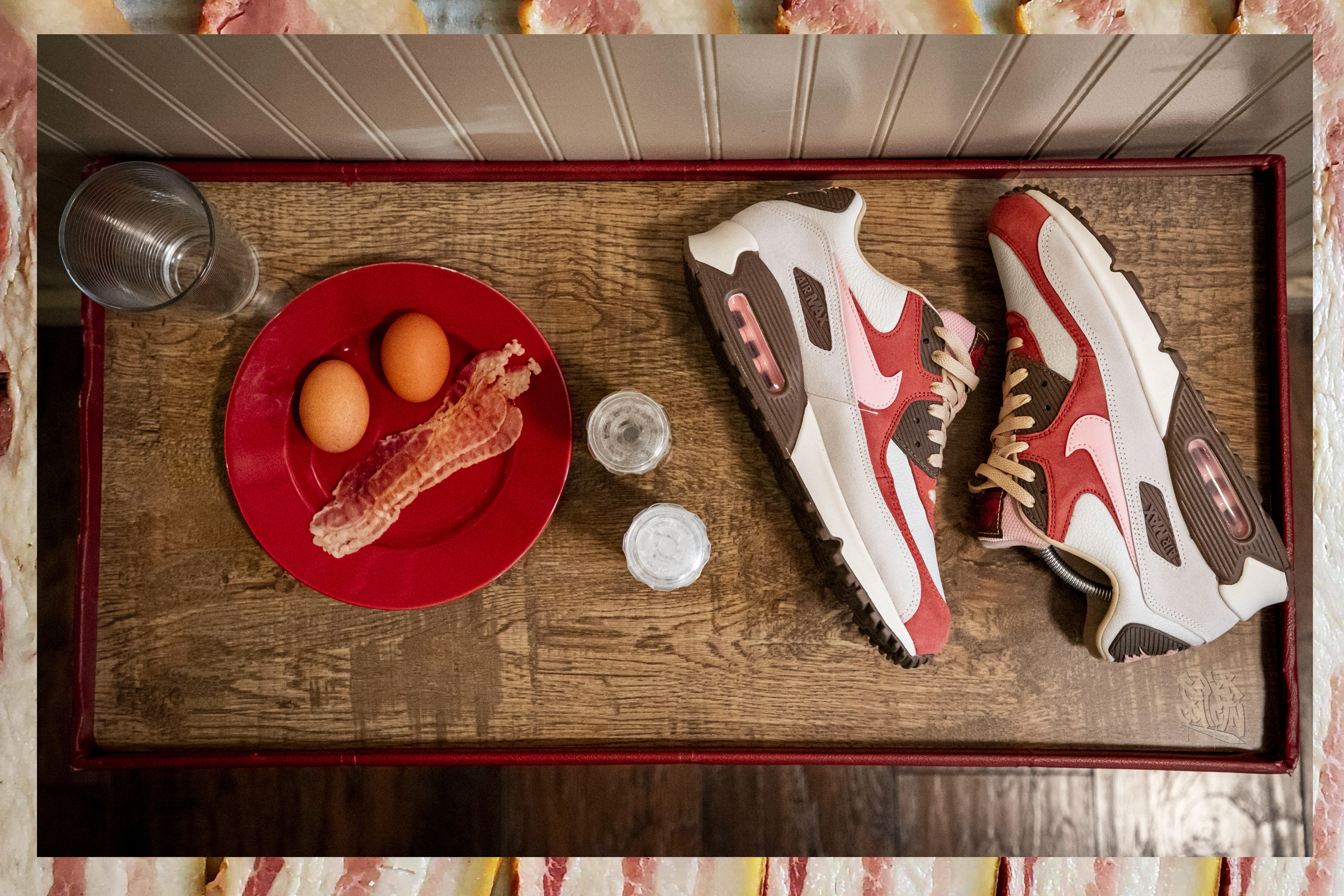 “Sail” and “Straw” are the two primary colors used, appearing on the leather toebox and quarter plus the suede mudgard. What really drives the “Bacon” inspiration home, however, is the rich red on the midfoot, below the throat and on the toe cap plus the lively pink on the Swooshes and tongue alike. Brown is introduced into the mix on the eyestays, midfoot window, tongue tag and heel badge — the last two pieces of which boast red (tag) and pink (heel) Nike Sportswear branding. This assemblage is largely faithful to the original pair, though some pundits have noted that the base shades appear slightly lighter than the original release.